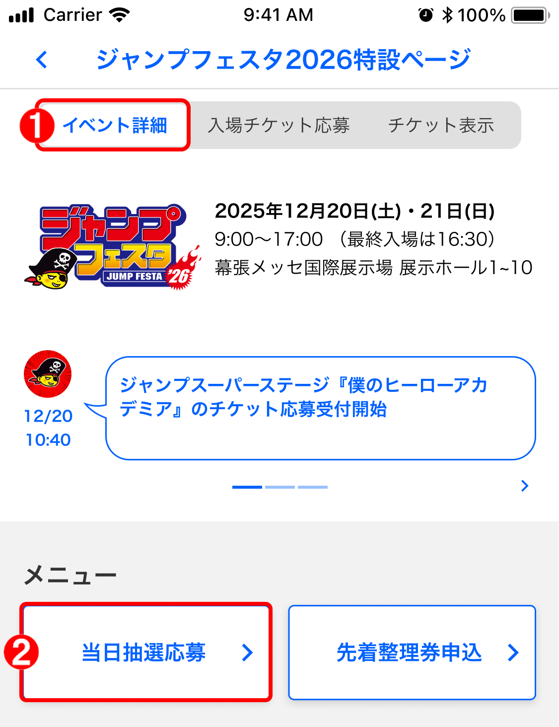 「ジャンプフェスタ2026特設ページ」のイベント詳細にて、「当日抽選応募」をタップしてください。