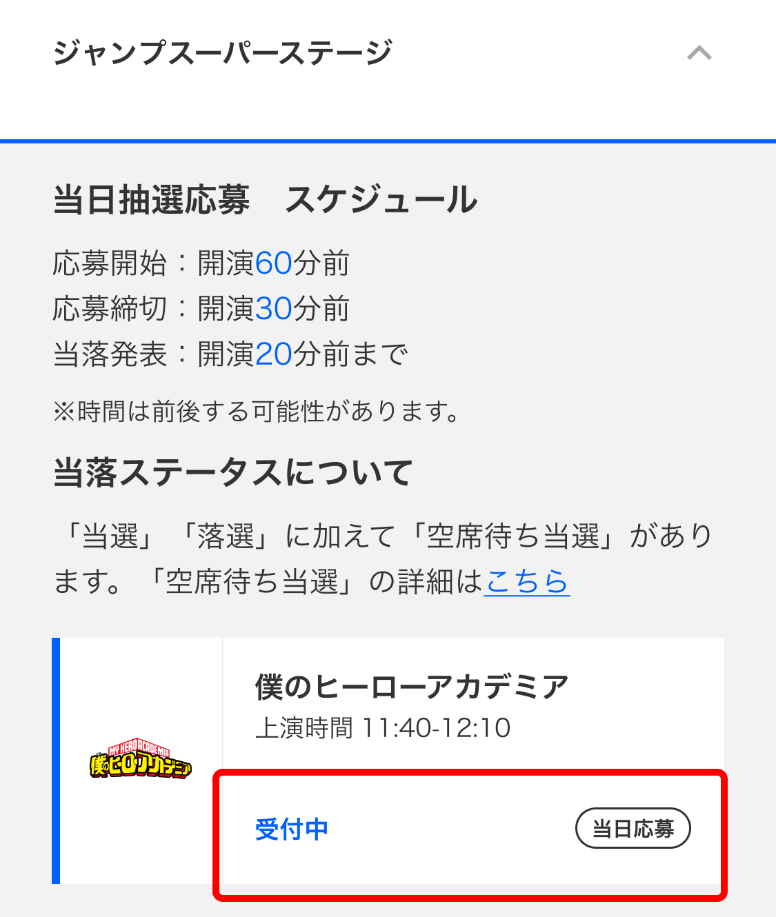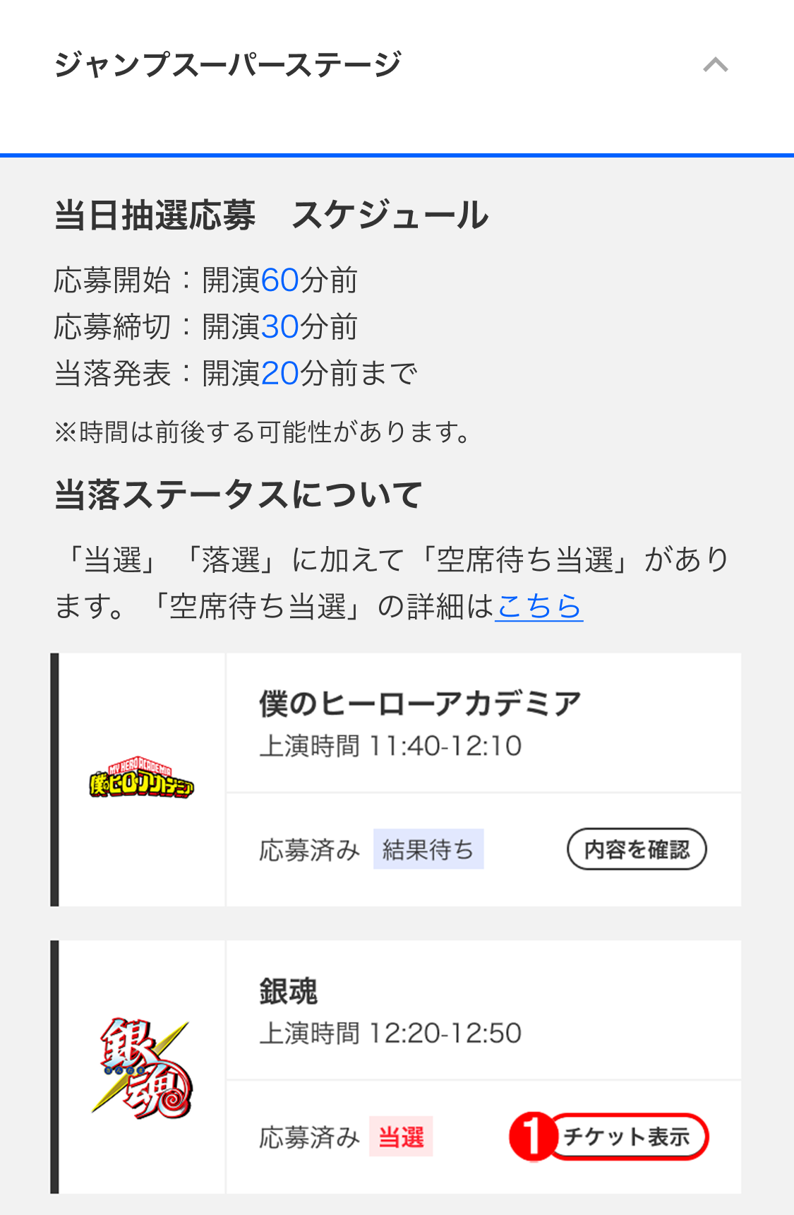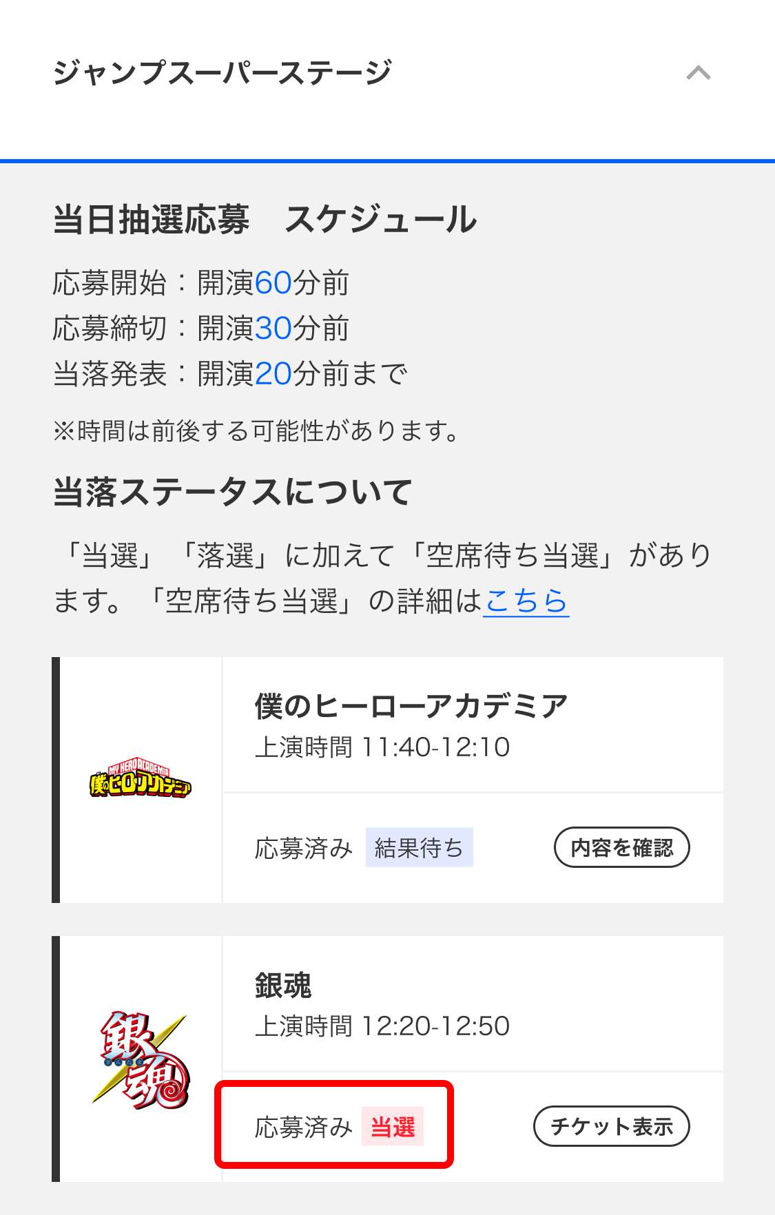 各ステージの当日抽選チケット応募には「当選」「落選」の他に「空席待ち当選」があります。