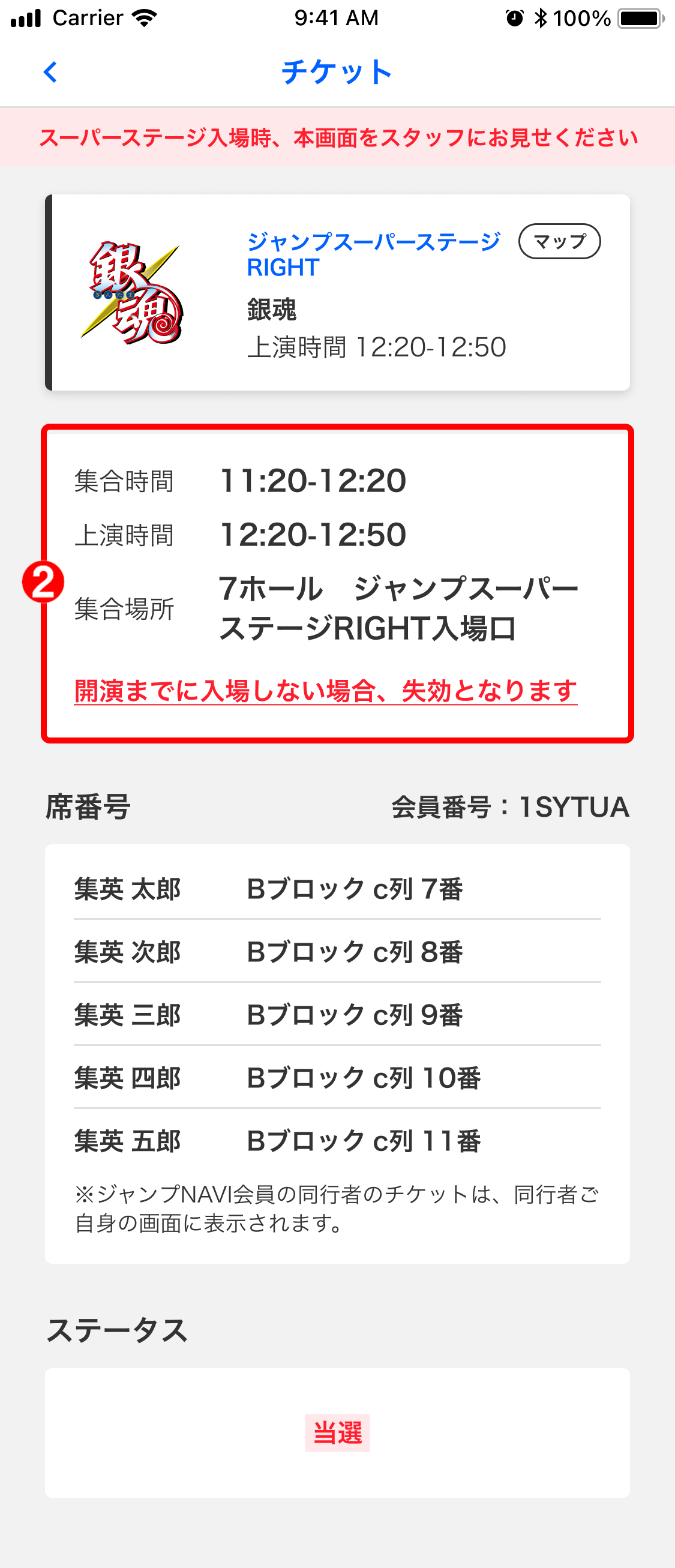 当落結果は開演時間の20分前までにメッセージに通知します。