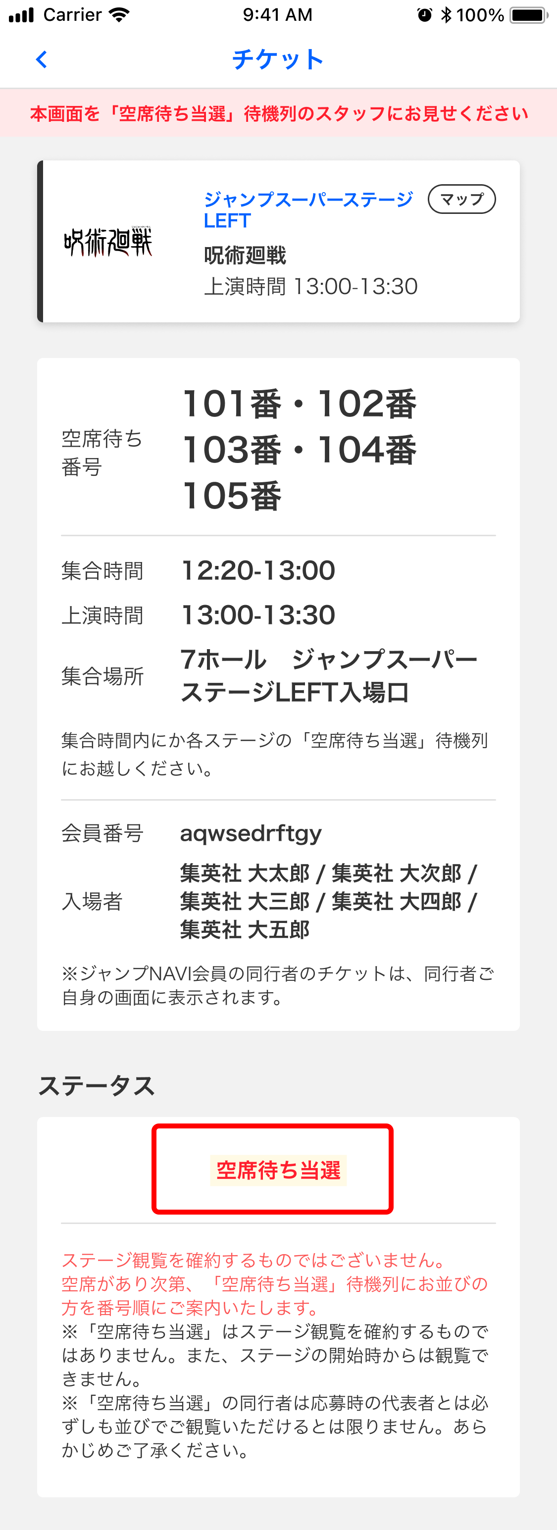 「空席待ち当選」となった場合は、集合時間に各ステージの「空席待ち当選」待機列にお越しください。