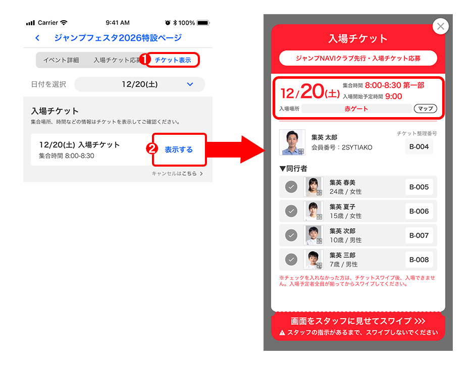 - ※入場チケットの応募時に同行者として応募された「ジャンプNAVI」会員の方は、入場後はご自身の「ジャンプNAVI」アプリで代表者とは別に先着整理券を取得いただくことが可能です。
